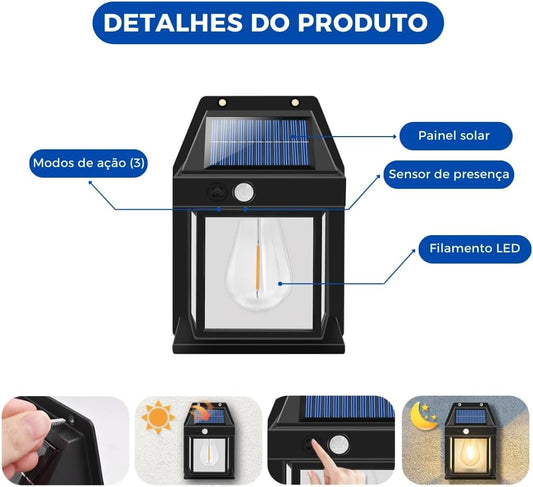 Luminária Refletor Solar LED à Prova da Água e Poeira IP65 Sensor De Movimentos Parede - Luz Quente